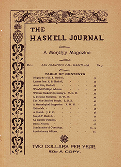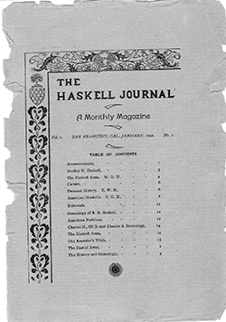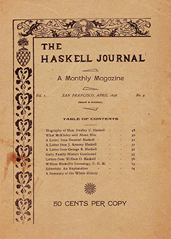 The first issues of Volume 1 were privately published as The Haskell Journal, a Monthly Magazine devoted to the History, Genealogy, Biography and Current News of the Haskell Family in America, and to Current and General Literature by D. H. Haskell, R. R. Haskell, and B. C. Haskell, all of California and perhaps all of San Francisco. The “editor and manager” of the publication was the infamous and storied Burnette Gregor Haskell 1857-1907. No formal Haskell organization was involved or developed as a result of this publication effort. Burnette Haskell was an attorney, a wild political and labor activist, and a member of the S. F. Bar Association. It was a private publication effort. Only four issues were produced, all from San Francisco: No. 1 Jan.1898, No. 2 Feb. 1898, No. 3 Mar. 1898, and No. 4 Apr. 1898. Publication was ceased after the fourth issue due to a lack of subscribers and money.