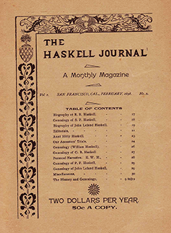 The first issues of Volume 1 were privately published as The Haskell Journal, a Monthly Magazine devoted to the History, Genealogy, Biography and Current News of the Haskell Family in America, and to Current and General Literature by D. H. Haskell, R. R. Haskell, and B. C. Haskell, all of California and perhaps all of San Francisco. The “editor and manager” of the publication was the infamous and storied Burnette Gregor Haskell 1857-1907. No formal Haskell organization was involved or developed as a result of this publication effort. Burnette Haskell was an attorney, a wild political and labor activist, and a member of the S. F. Bar Association. It was a private publication effort. Only four issues were produced, all from San Francisco: No. 1 Jan.1898, No. 2 Feb. 1898, No. 3 Mar. 1898, and No. 4 Apr. 1898. Publication was ceased after the fourth issue due to a lack of subscribers and money.
