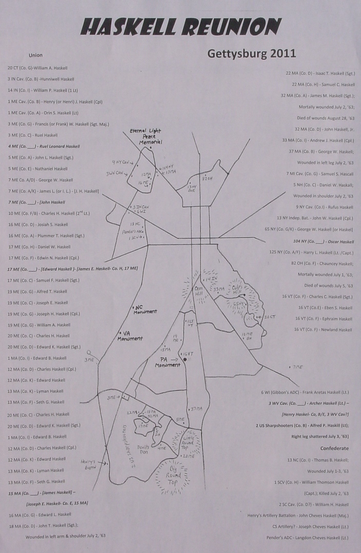 Ed was a wealth of information and told a number of stories of Haskells who fought at Gettysburg including Capt. William Thomson Haskell on the confederate side and Lt. Frank Aretas Haskell, the Aide-de-Camp to Gen. Gibbon on the Union side. (See Issue 31, Vol. 8, No. 4, 1992 of the Haskell Journal for a long article on Lt. Frank Aretas Haskell.)