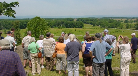 We climbed aboard the bus at 8:45 am on Saturday for a delightful and informative three-hour tour of the Soldiers’ National Cemetery and battlefield. Our tour guide, Ed Guy, handed out a large sheet to everyone entitled HASKELL REUNION—Gettysburg 2011. He had drawn a large map of the battlefield in the center of the sheet and then on each side he had listed all of the Haskells who fought at Gettysburg together with their state regiment and company. You can see a photo of this sheet by clicking here.
