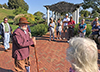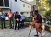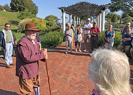 At 9 o'clock Saturday morning, Leo led the group from the Jenney Museum down the path behind the Jenney Grist Mill along Town Brook, with a stop at Brewster Gardens before making our way to Plymouth Rock. Along the way, Leo told interesting stories about the early Pilgrim settlement. Just before reaching Plymouth Rock, we took another group picture in front of the statue of William Bradford, Governor and Historian of the Plymouth Colony (see cover photo of this issue). Across the street from Plymouth Rock, we took another group picture in front of the Pilgrim Mother Statue and the Fountain to the Pilgrim Mothers of the Mayflower. This statue was a gift from the Daughters of the American Revolution in 1921. On the shaft of the fountain behind the statue, are listed the names of all of the women who came on the Mayflower. We stopped at the statue of Massasoit, the great Sachem of the Wampanoags, and then moved on to the stone sarcophagus containing the remains found on Coles Hill in 1921. On the side of the sarcophagus are engraved the names of the nearly half of the Mayflower passengers who died during the first year. Leo ended his tour inside the 1749 Court House Museum on Town Square, where we were able to sit down and listen to Leo’s final stories.